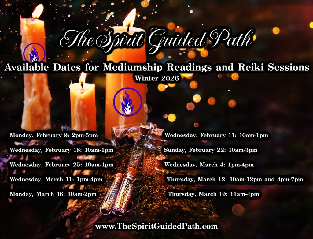 Current availability for readings and Reiki sessions for Winter 2026. All remaining January appointments will be held on Zoom, with some in person options available for February and March. All times listed are in Canadian Central Time.